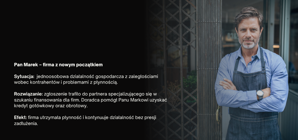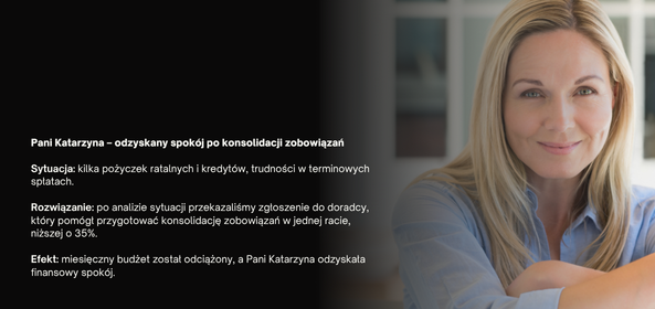 Każda sytuacja finansowa jest inna. Dlatego podchodzimy do każdego zgłoszenia indywidualnie, łącząc naszych Klientów z doradcami, którzy pomagają im wyjść z trudności. Zobacz przykłady historii zakończonych sukcesem.